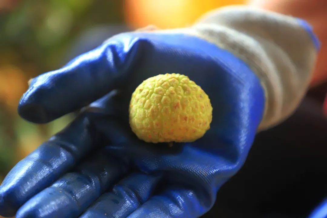 “2008年我参观完别地的荔枝果园后,就萌生了改良品种的想法。我将引进的果苗嫁接在桂味、挂绿荔枝树上。最初的果实品质不佳,后来通过嫁接水晶球、挂绿等优质品种,并坚持施用有机肥,经过反复试验,才有了现在果型大且漂亮的佛绿荔枝,最大单果能达到50克。”