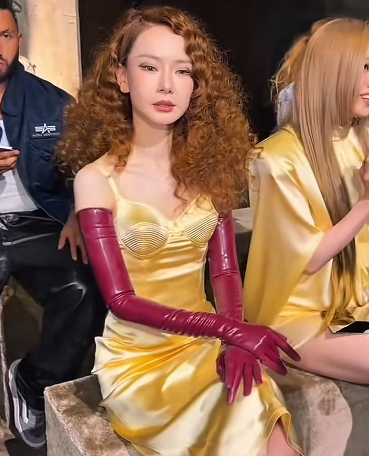 爆炸的羊毛卷、金黄色的吊带裙、再加上酒红色的皮手套,怎么看怎么像理发店的老板娘。