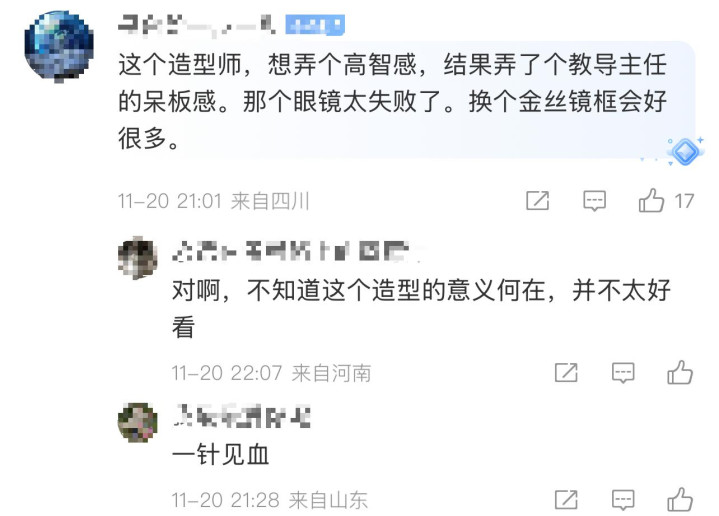 更有网友将问题放在造型师身上,明明想弄个高智感,结果却成了教导主任的呆板感,尤其是那个眼镜,实在太失败了,不知道这样的造型有啥意义,一点都不好看。