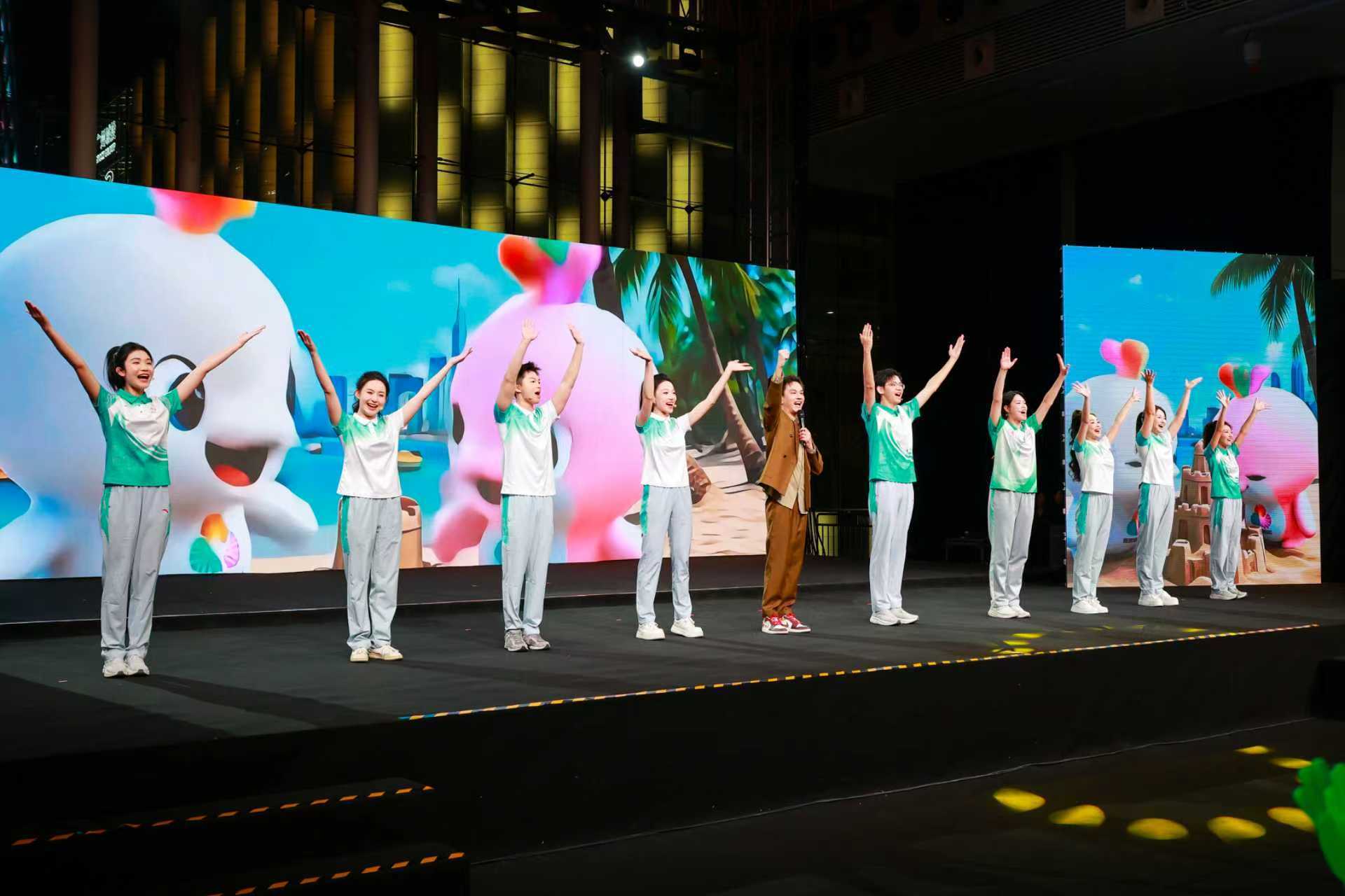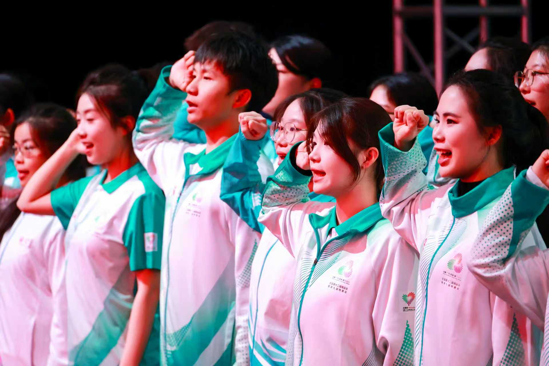 活动高潮之际,在粤港澳三地的领誓人带领下,全场志愿者庄严举起右拳,重温誓言:“我志愿,成为光荣的志愿者,践行奉献、友爱、互助、进步的志愿精神……”铮铮誓言回荡夜空,展现了湾区青年志愿者的集体担当与时代使命,这是1.3万赛会志愿者、1.8万城市志愿者以及数以万计的新彩广州全民志愿行动志愿者心跳的合鸣,也是广州“志愿之城”面向未来最铿锵有力的青春宣言。最后,活动在激昂澎湃的《气势如虹》合唱中圆满落幕。